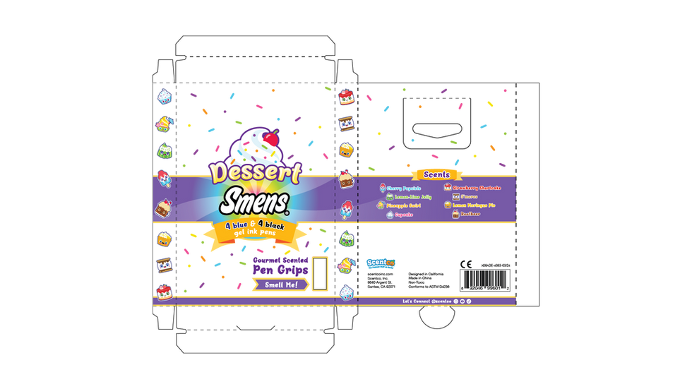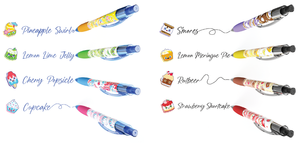 The pens were designed around Scentco's most popular dessert scents: Pineapple Swirl, Lemon-Lime Jelly, Cherry Popsicle, Cupcake, S'mores, Lemon Meringue Pie, Rootbeer, Strawberry Shortcake.