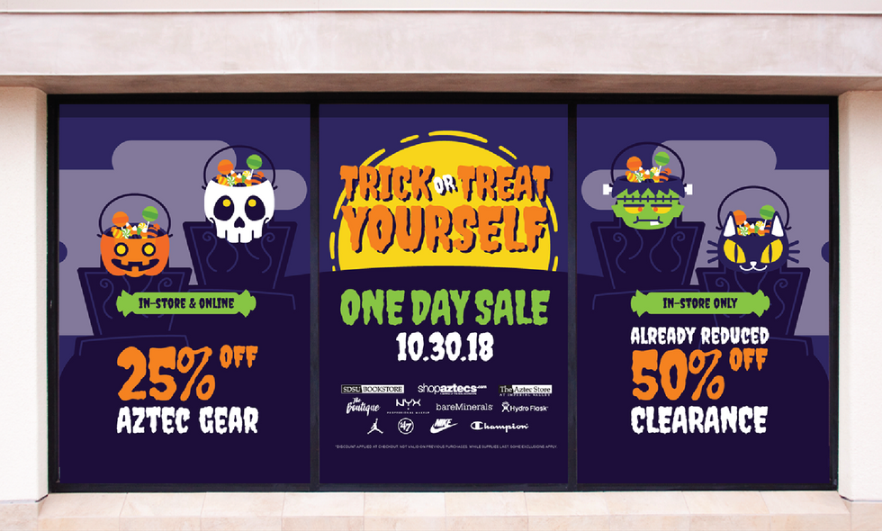 Trick or Treat yourself is a marketing campaign promoting the In-Store and Online Fall Sales during the Halloween Season at the SDSU Bookstore.